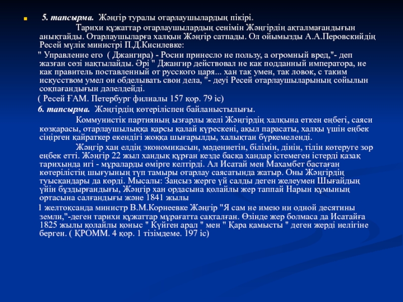5. тапсырма. Жәңгір туралы отарлаушылардың пікірі.