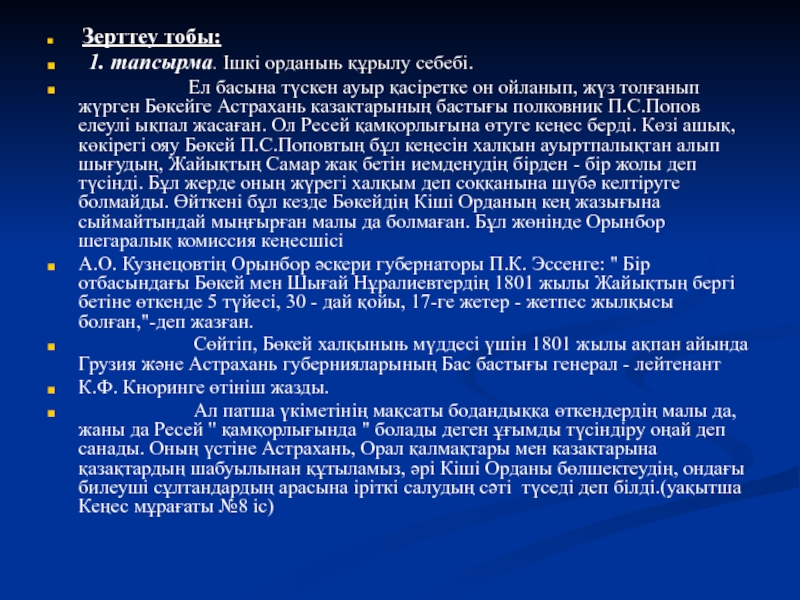 Сөйтіп, Бөкей халқыныњ мүддесі үшін 1801 жылы ақпан айында Грузия және Астрахань губернияларының Бас бастығы генерал - лейтенант
