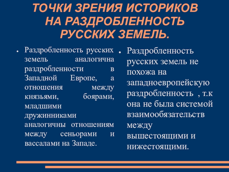 Раздробленность русских земель не похожа на западноевропейскую раздробленность , т.к она не была системой взаимообязательств между вышестоящими и нижестоящими.