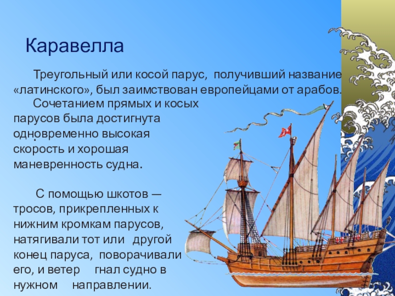Сочетанием прямых и косых парусов была достигнута одновременно высокая скорость и хорошая маневренность судна.