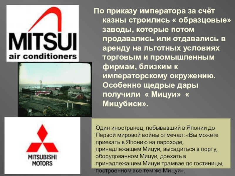 Один иностранец, побывавший в Японии до Первой мировой войны отмечал: «Вы можете приехать в Японию на пароходе, принадлежащем Мицуи, высадиться в порту, оборудованном Мицуи, доехать в принадлежащем Мицуи трамвае до гостиницы, построенном все тем же Мицуи».