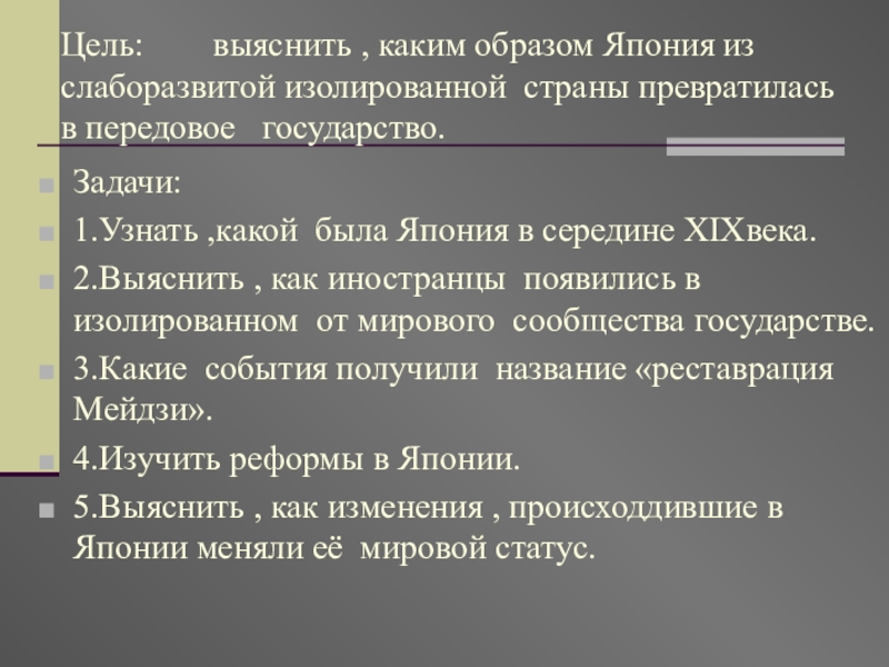 5.Выяснить , как изменения , происходдившие в Японии меняли её мировой статус.