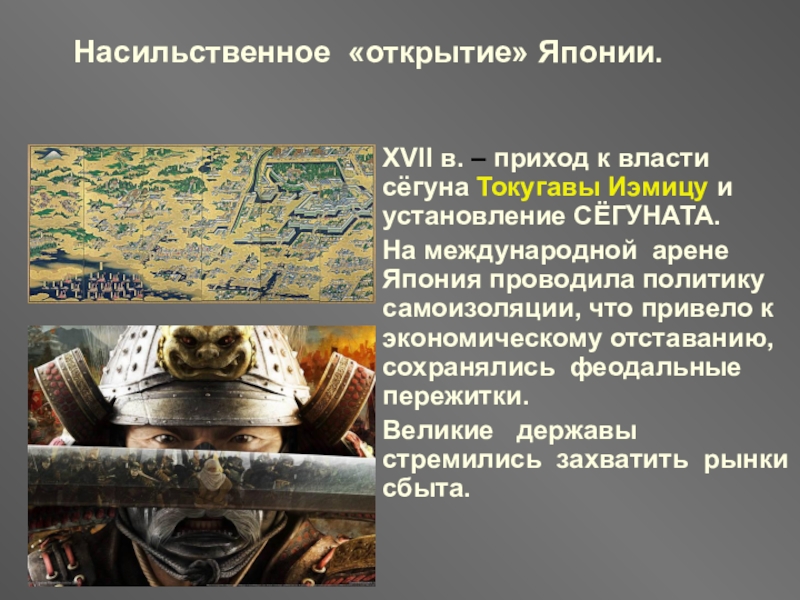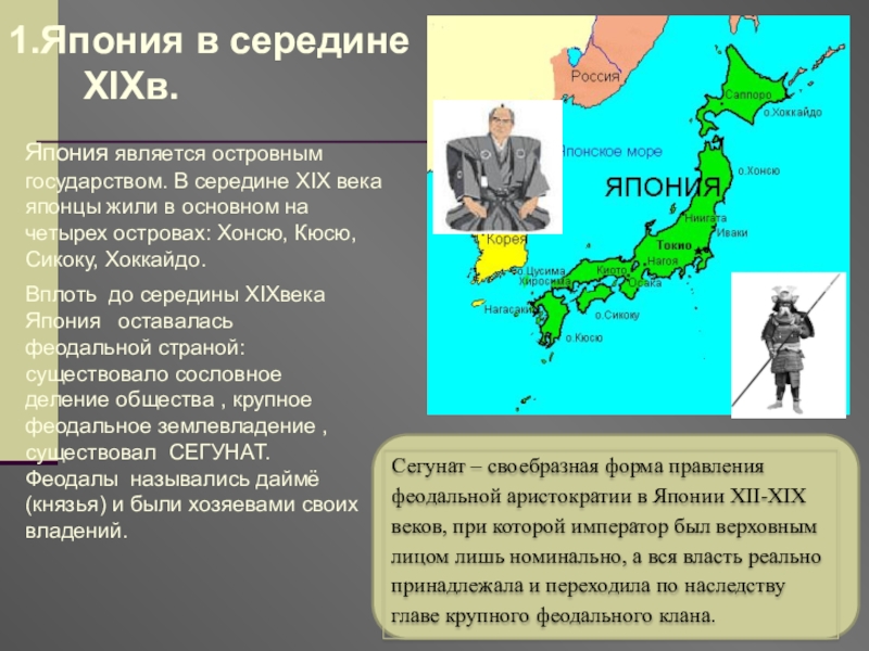 Вплоть до середины XIXвека Япония оставалась феодальной страной: существовало сословное деление общества , крупное феодальное землевладение , существовал СЕГУНАТ.