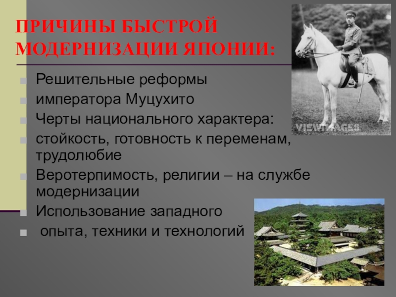Модернизация общества-преодоление феодальных черт в развитии страны, проведение преобразований в социально – экономической и политической жизни с целью создания собственной промышленности.