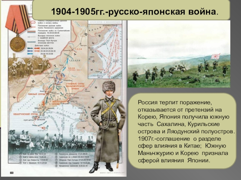Россия терпит поражение, отказывается от претензий на Корею, Япония получила южную часть Сахалина, Курильские острова и Ляодунский полуостров.