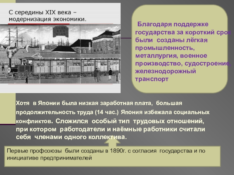 продолжительность труда (14 час.) Япония избежала социальных конфликтов. Сложился особый тип трудовых отношений, при котором работодатели и наёмные работники считали себя членами одного коллектива.