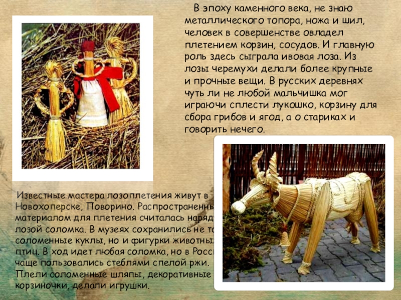 Известные мастера лозоплетения живут в Новохоперске – В.В. Давыденко, Станислав Болковой, в Поворино – Иван Бобылев.