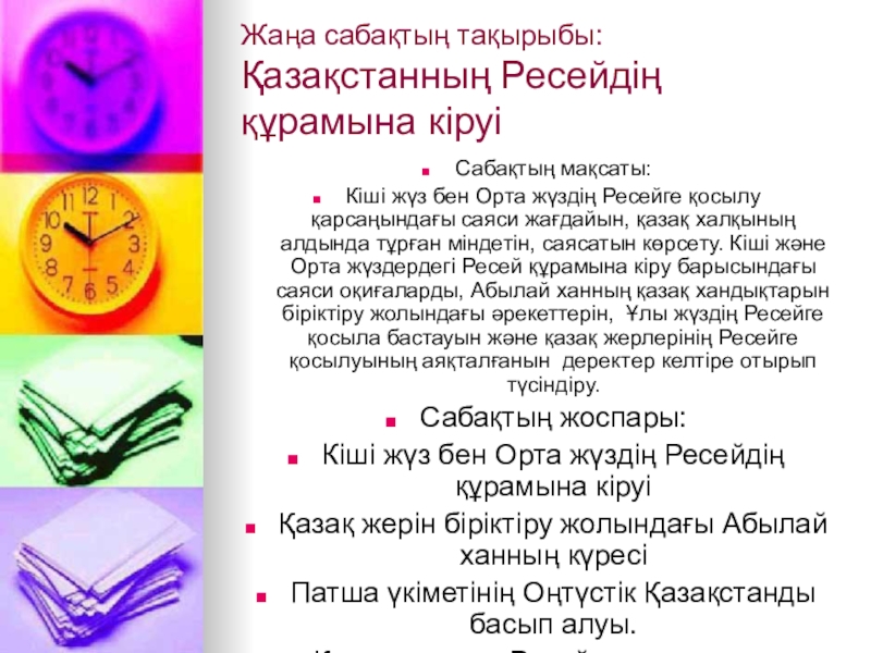 Жаңа сабақтың тақырыбы: Қазақстанның Ресейдің құрамына кіруіСабақтың мақсаты:Кіші жүз бен Орта жүздің Ресейге қосылу қарсаңындағы саяси жағдайын, қазақ халқының алдында тұрған міндетін, саясатын көрсету. Кіші және Орта жүздердегі Ресей құрамына кіру барысындағы саяси оқиғаларды, Абылай ханның