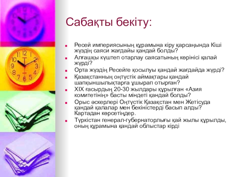 Сабақты бекіту:Ресей империясының құрамына кіру қарсаңында Кіші жүздің саяси жағдайы қандай болды?Алғашқы күштеп отарлау саясатының көрінісі қалай