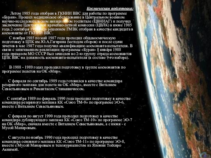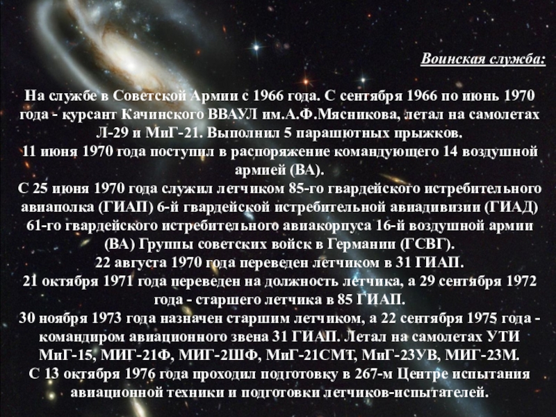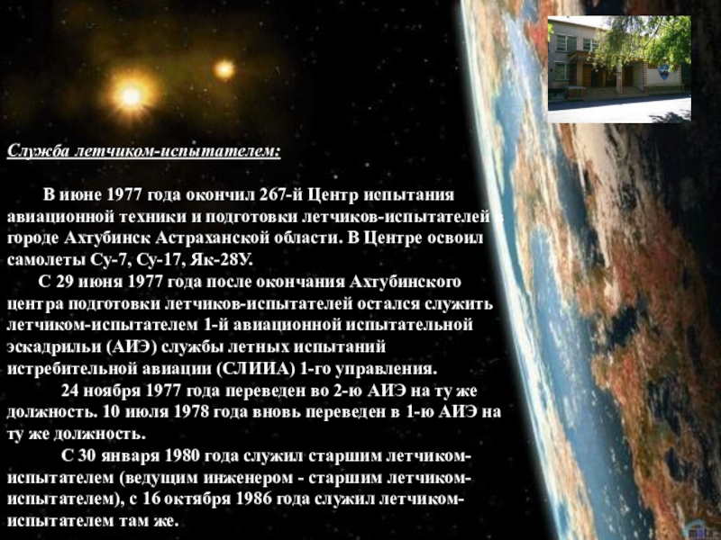 С 13 октября 1976 года проходил подготовку в 267-м Центре испытания авиационной техники и подготовки летчиков-испытателей.