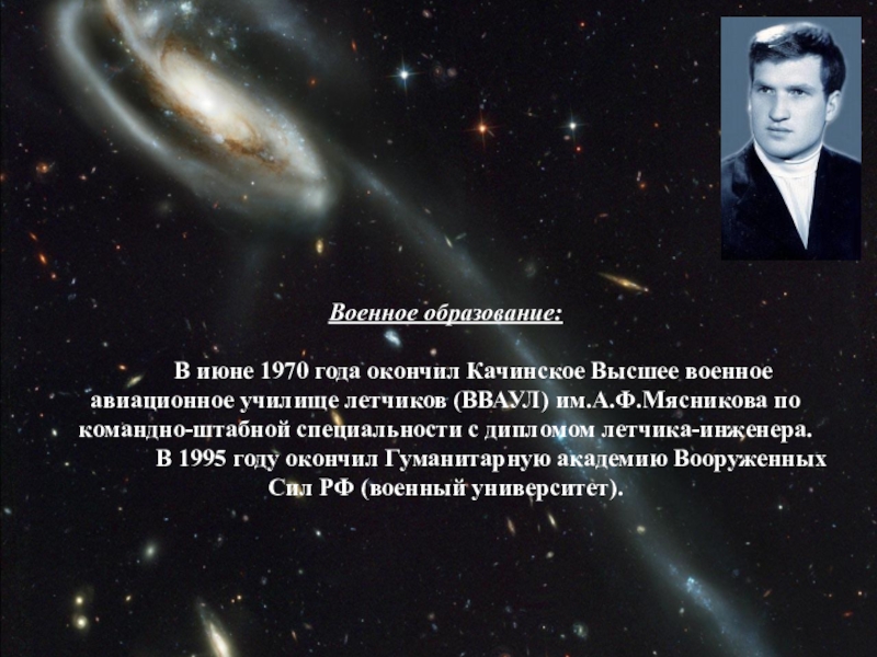 1966 по июнь 1970 года - курсант Качинского ВВАУЛ им.А.Ф.Мясникова, летал на самолетах Л-29 и МиГ-21. Выполнил 5 парашютных прыжков.