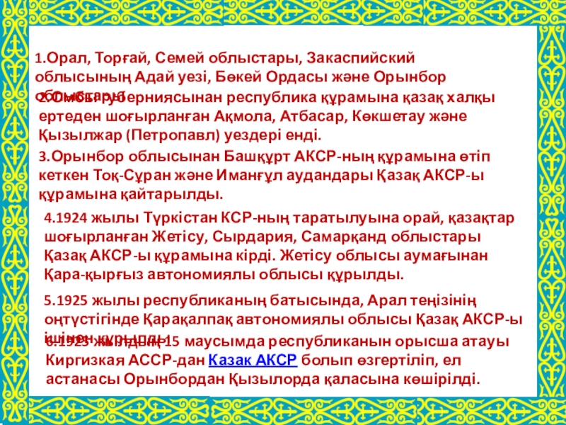 3.Орынбор облысынан Башқұрт АКСР-ның құрамына өтіп кеткен Тоқ-Сұран және Иманғұл аудандары Қазақ АКСР-ы құрамына қайтарылды.
