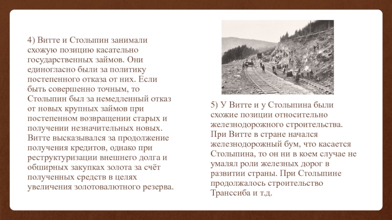 5) У Витте и у Столыпина были схожие позиции относительно железнодорожного строительства. При Витте в стране начался железнодорожный бум, что касается Столыпина, то он ни в коем случае не умалял роли железных дорог в развитии страны. При Столыпине продолжалось строительство Транссиба и т.д.