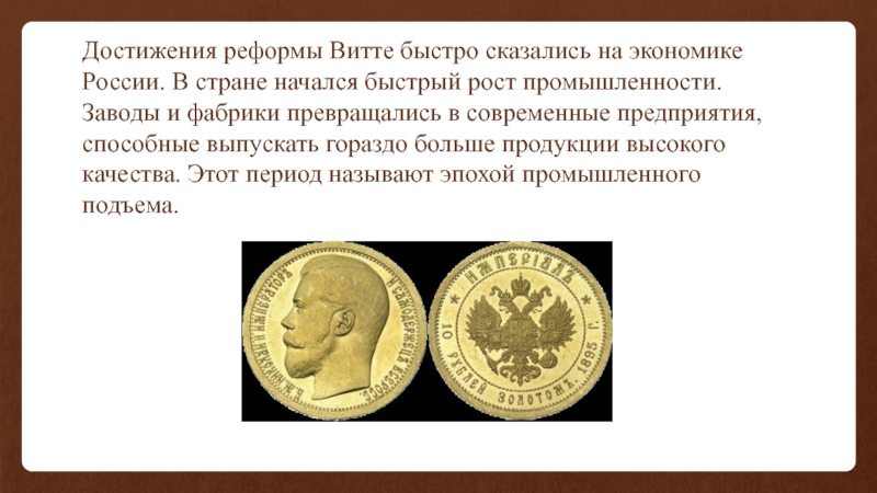 Слайд 15Достижения реформы Витте быстро сказались на экономике России. В стране начался