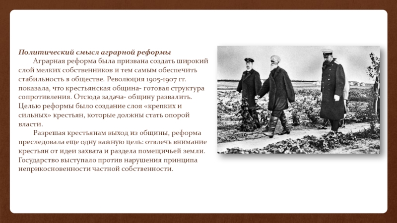 Разрешая крестьянам выход из общины, реформа преследовала еще одну важную цель: отвлечь внимание крестьян от идеи захвата и раздела помещичьей земли. Государство выступало против нарушения принципа неприкосновенности частной собственности.