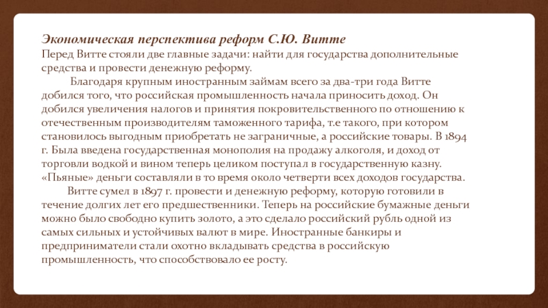 Благодаря крупным иностранным займам всего за два-три года Витте добился того, что российская промышленность начала приносить доход. Он добился увеличения налогов и принятия покровительственного по отношению к отечественным производителям таможенного тарифа, т.е такого, при котором становилось выгодным приобретать не заграничные, а российские товары. В 1894 г. Была введена государственная монополия на продажу алкоголя, и доход от торговли водкой и вином теперь целиком поступал в государственную казну. «Пьяные» деньги составляли в то время около четверти всех доходов государства.