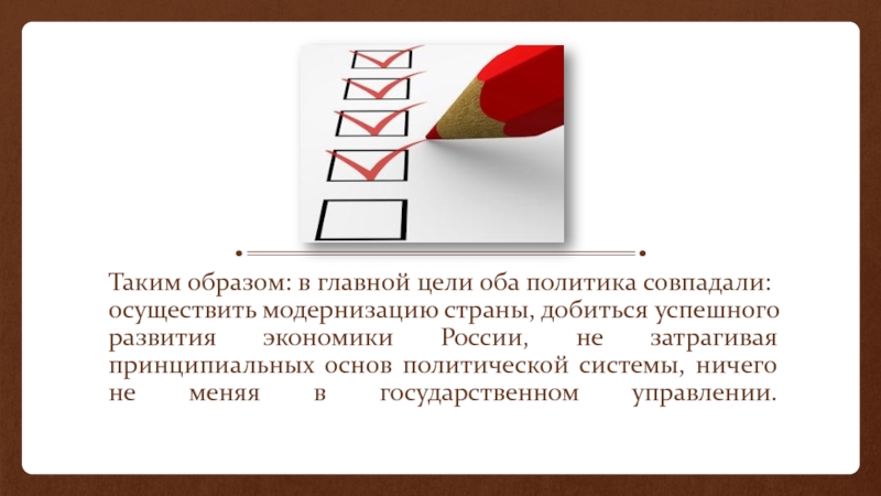 Слайд 7Таким образом: в главной цели оба политика совпадали: осуществить модернизацию страны,