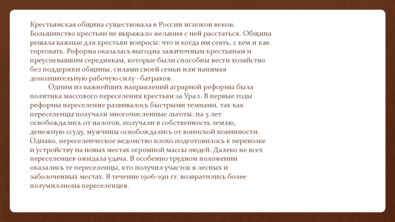 желания с ней расстаться. Община решала важные для крестьян вопросы: что и когда им сеять, с кем и как торговать. Реформа оказалась выгодна зажиточным крестьянам и преуспевавшим середнякам, которые были способны вести хозяйство без поддержки общины, силами своей семьи или нанимая дополнительную рабочую силу –батраков.