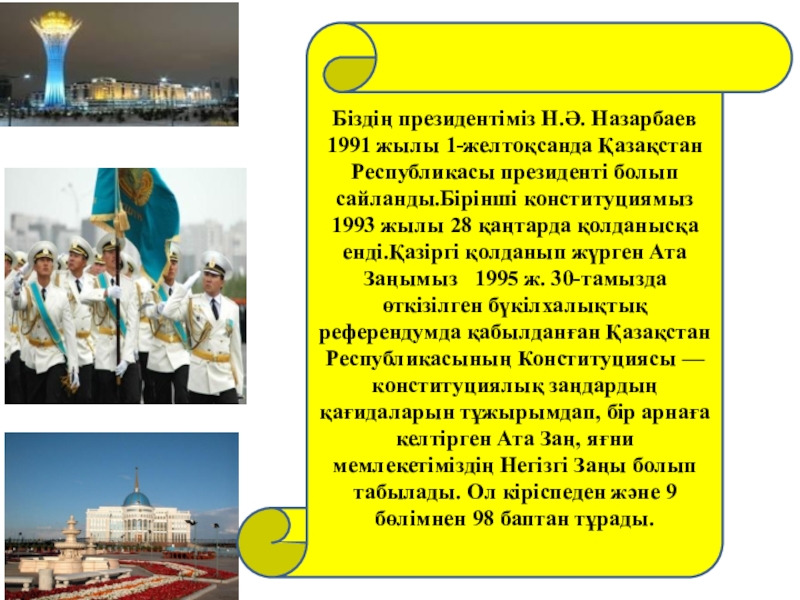 Біздің президентіміз Н.Ә. Назарбаев 1991 жылы 1-желтоқсанда Қазақстан Республикасы президенті болып сайланды.Бірінші конституциямыз 1993 жылы 28 қаңтарда