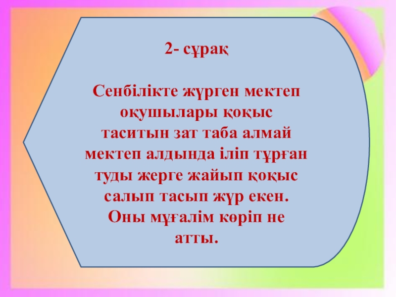 2- сұрақСенбілікте жүрген мектеп оқушылары қоқыс таситын зат таба алмай мектеп алдында іліп тұрған туды жерге жайып