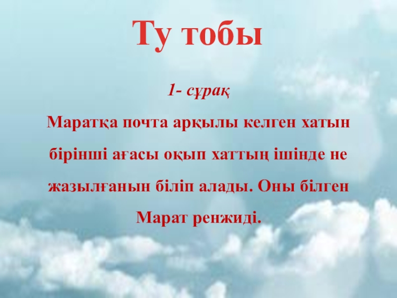 Ту тобы1- сұрақМаратқа почта арқылы келген хатын бірінші ағасы оқып хаттың ішінде не жазылғанын біліп алады. Оны