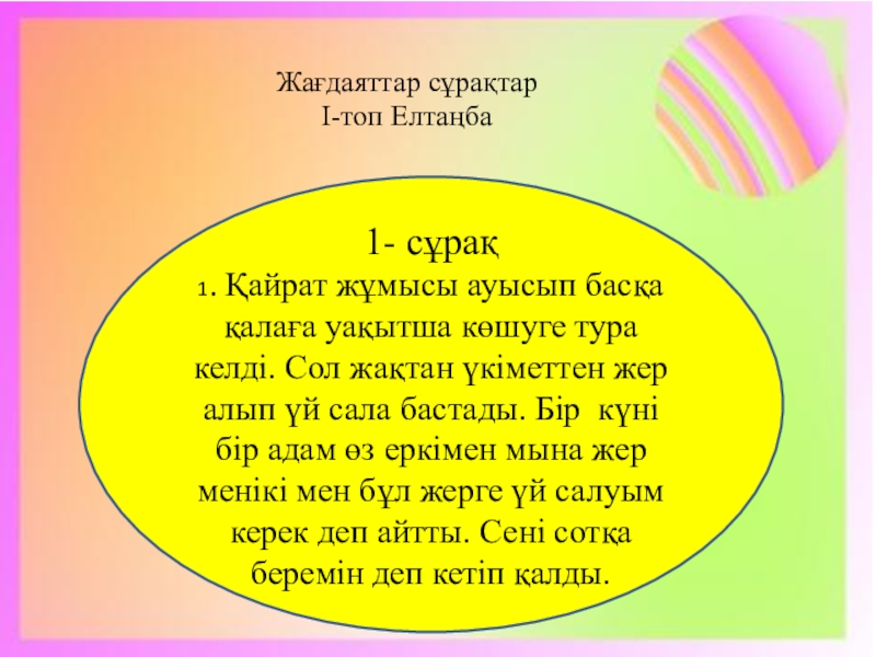Жағдаяттар сұрақтарІ-топ Елтаңба 1- сұрақ1. Қайрат жұмысы ауысып басқа қалаға уақытша көшуге тура келді. Сол жақтан үкіметтен