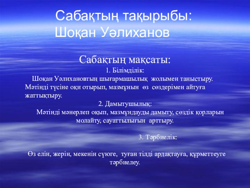 Сабақтың тақырыбы: Шоқан Уәлиханов Сабақтың мақсаты: 1. Білімділік:  Шоқан Уәлихановтың шығармашылық