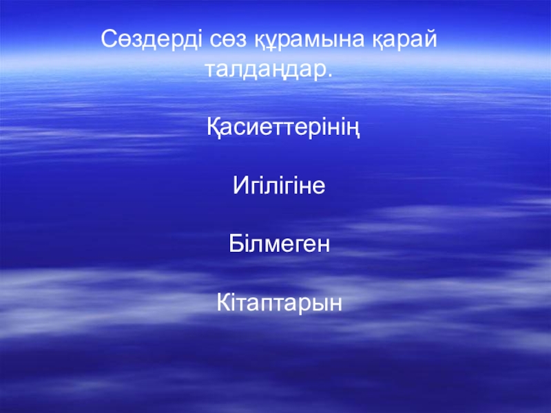 Сөздерді сөз құрамына қарай талдаңдар.  Қасиеттерінің  Игілігіне  Білмеген  Кітаптарын