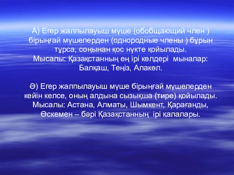 Мысалы: Қазақстанның ең ірі көлдері мыналар: Балқаш, Теңіз, Алакөл.