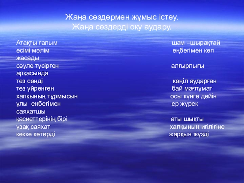 Жаңа сөздермен жұмыс істеу.Жаңа сөздерді оқу аудару.Атақты ғалым