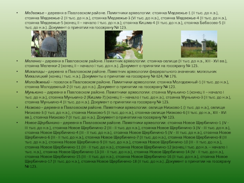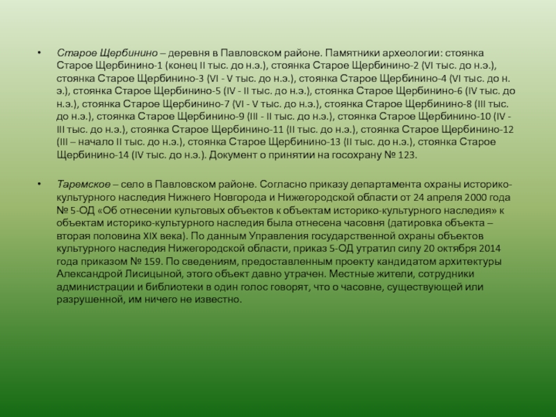 Слайд 17Старое Щербинино – деревня в Павловском районе. Памятники археологии: стоянка Старое Щербинино-1