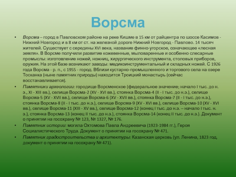 Ворсма – город в Павловском районе на реке Кишме в 15 км
