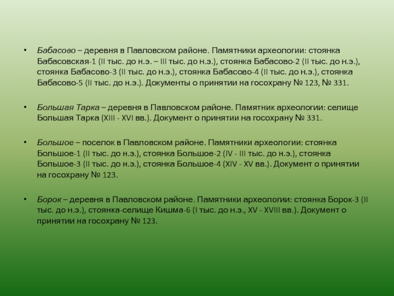Бабасово – деревня в Павловском районе. Памятники археологии: стоянка Бабасовская-1 (II тыс.