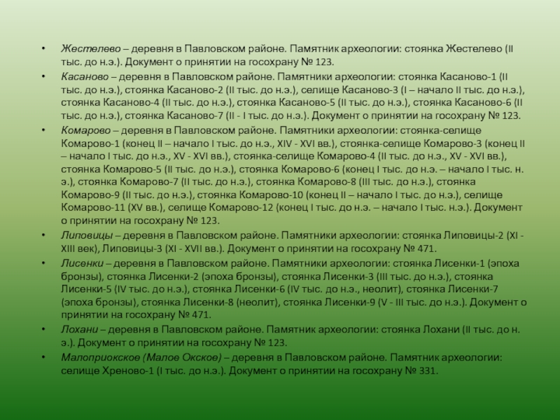 Слайд 14Жестелево – деревня в Павловском районе. Памятник археологии: стоянка Жестелево (II тыс.