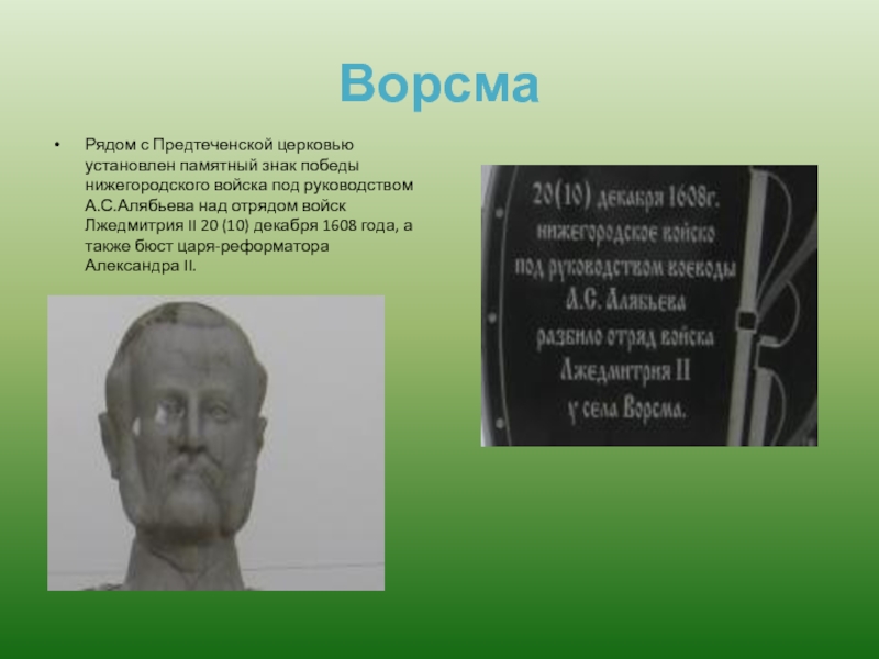 руководством А.С.Алябьева над отрядом войск Лжедмитрия II 20 (10) декабря 1608 года, а также бюст царя-реформатора Александра II.