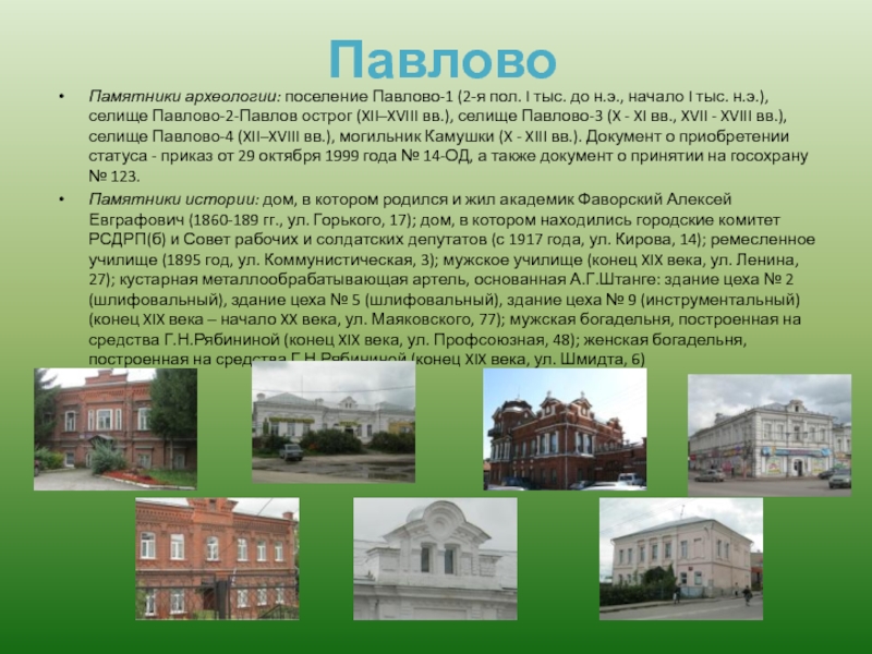 тыс. н.э.), селище Павлово-2-Павлов острог (XII–XVIII вв.), селище Павлово-3 (X - XI вв., XVII - XVIII вв.), селище Павлово-4 (XII–XVIII вв.), могильник Камушки (X - XIII вв.). Документ о приобретении статуса - приказ от 29 октября 1999 года № 14-ОД, а также документ о принятии на госохрану № 123.