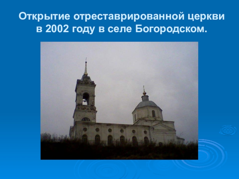 Слайд 21Открытие отреставрированной церкви в 2002 году в селе Богородском.