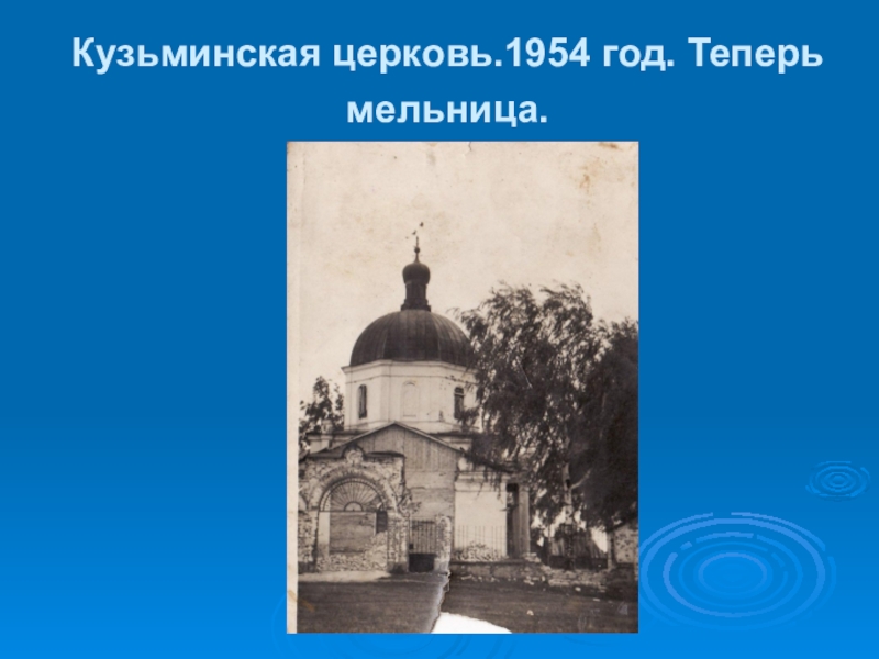 Слайд 27Кузьминская церковь.1954 год. Теперь мельница.