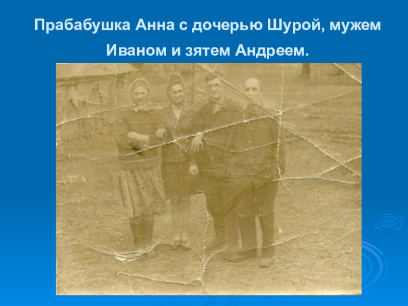 Слайд 10Прабабушка Анна с дочерью Шурой, мужем Иваном и зятем Андреем.