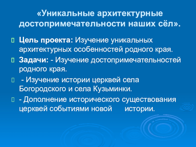 «Уникальные архитектурные достопримечательности наших сёл».Цель проекта: Изучение уникальных архитектурных особенностей родного края.Задачи: - Изучение достопримечательностей родного края.