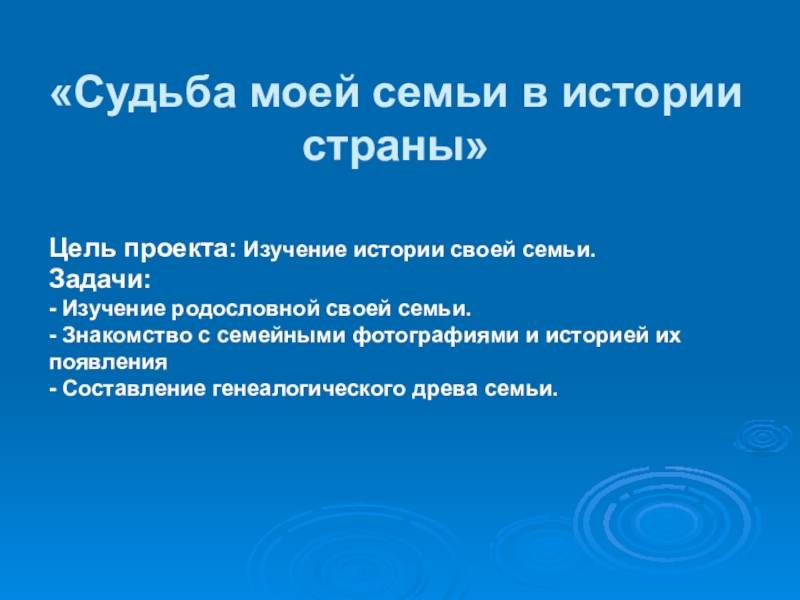 «Судьба моей семьи в истории   страны»Цель проекта: Изучение истории своей семьи.Задачи: - Изучение родословной своей