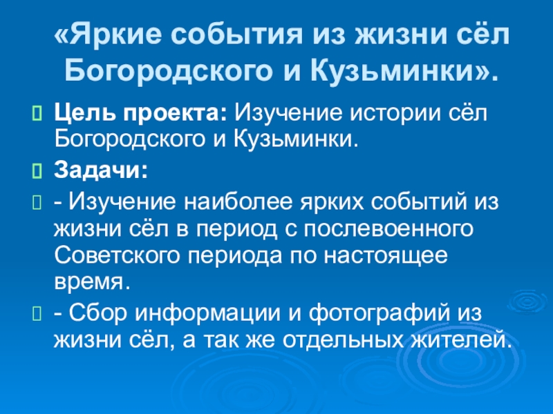 «Яркие события из жизни сёл Богородского и Кузьминки».Цель проекта: Изучение истории сёл Богородского и Кузьминки.Задачи: - Изучение