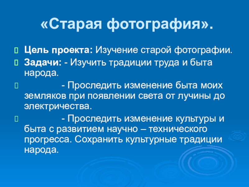 «Старая фотография».Цель проекта: Изучение старой фотографии.Задачи: - Изучить традиции труда и быта народа.