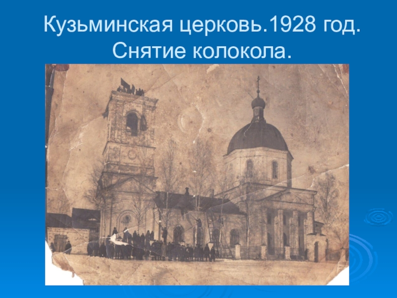Слайд 26Кузьминская церковь.1928 год. Снятие колокола.