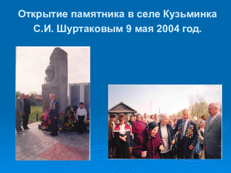 Слайд 23Открытие памятника в селе Кузьминка С.И. Шуртаковым 9 мая 2004 год.