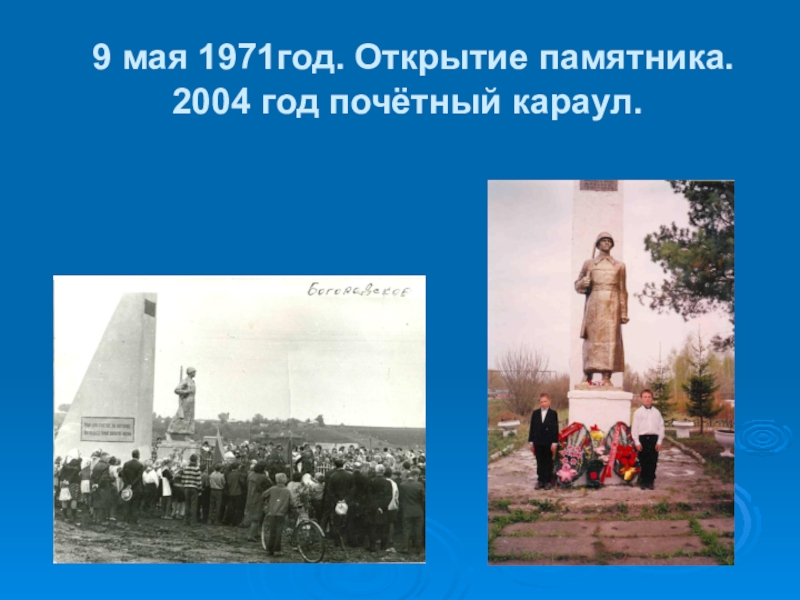 9 мая 1971год. Открытие памятника. 2004 год почётный караул.