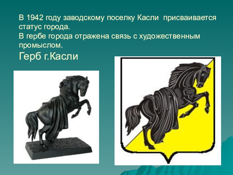 присваивается статус города. В гербе города отражена связь с художественным промыслом. Герб г.Касли
