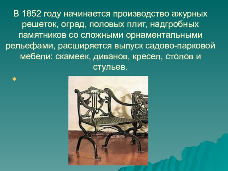 Слайд 6В 1852 году начинается производство ажурных решеток, оград, половых плит, надгробных