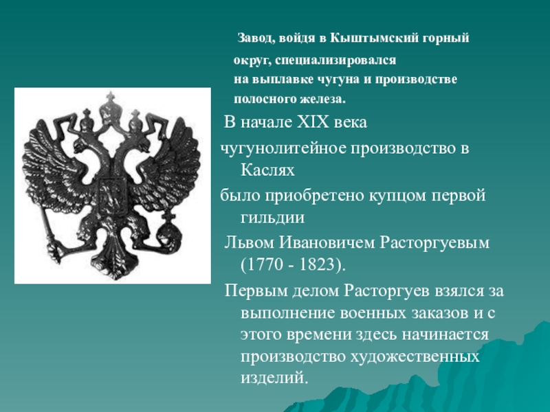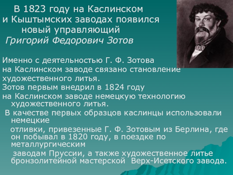 В 1823 году на Каслинском и Кыштымских заводах появился новый управляющий Григорий Федорович Зотов Именно с деятельностью Г. Ф. Зотова на Каслинском заводе связано становление художественного литья. Зотов первым