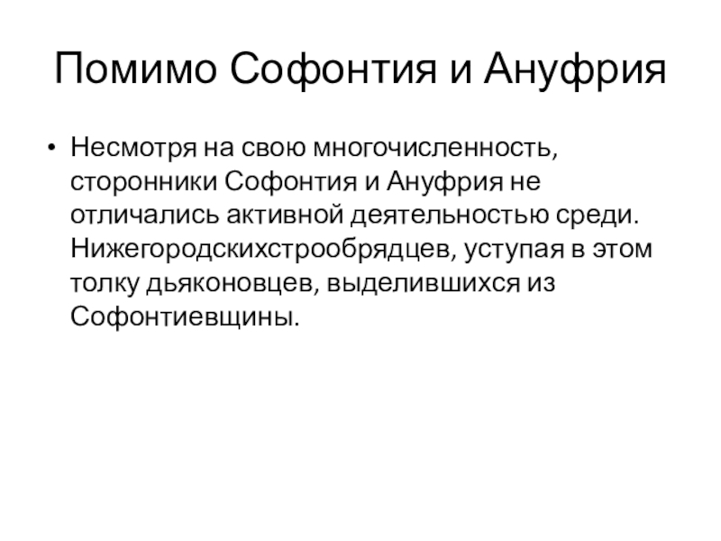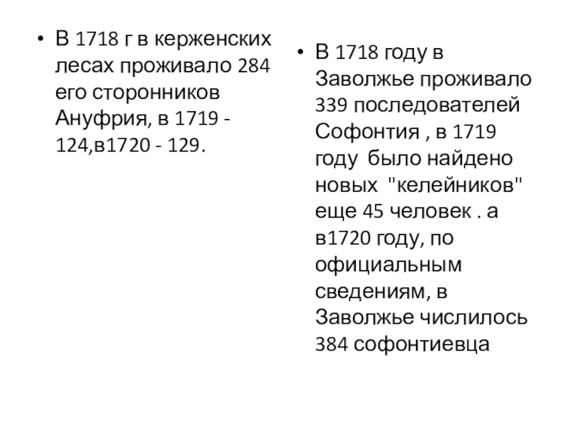 В 1718 году в Заволжье проживало 339 последователей Софонтия , в 1719 году было найдено новых "келейников" еще 45 человек . а в1720 году, по официальным сведениям, в Заволжье числилось 384 софонтиевца